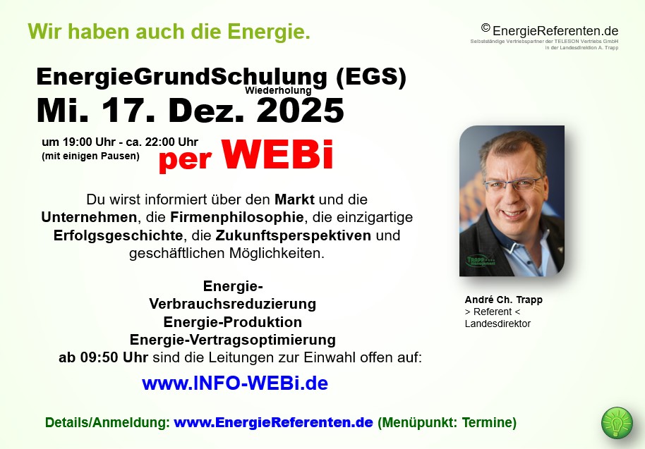 Teilnahmebedingungen: Du bist neue VP mit einer eigenen VP-Nr. in unserer Landesdirektion A. Trapp und optional bereits an einer EnergieGrundSchulung (EGS) teilgenommen.
